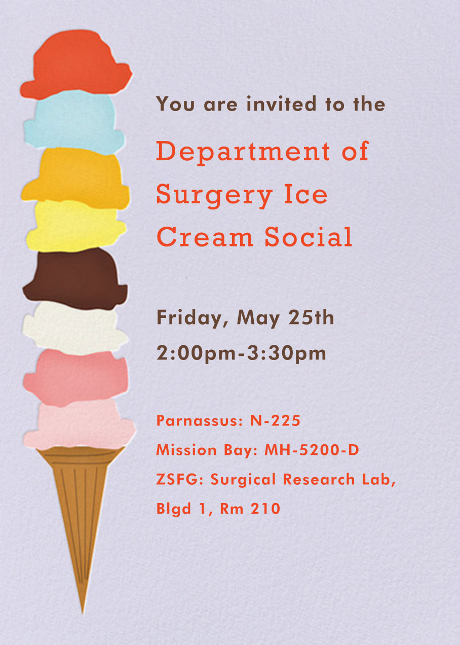 The next event, Department of Surgery Ice Cream Social, will take place on Friday, May 25th at 2:00pm - 3:30pm at the following campuses: